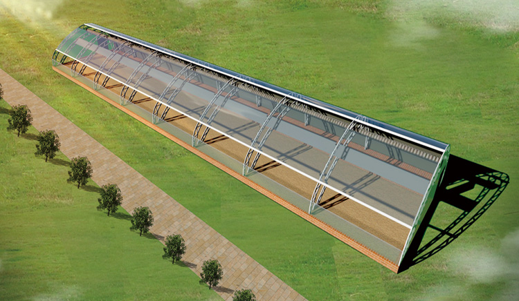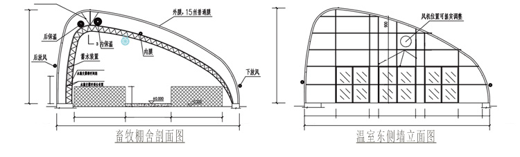 水蓄熱陽光畜牧棚舍配套設(shè)備包括:棚舍主體、骨架系統(tǒng)、外覆蓋系統(tǒng)、放風(fēng)系統(tǒng)、內(nèi)保溫系統(tǒng)、內(nèi)膜系統(tǒng)、新型蓄熱裝置等。