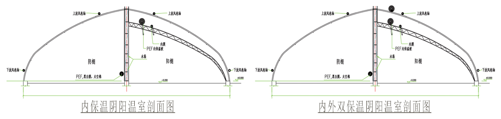 水蓄熱內(雙)保溫裝配式陰陽溫室配套設備包括:溫室主體、骨架系統、(前坡、后坡)外膜系統、(前坡)內膜系統、(前后坡上、下)放風系統、(前坡)內保溫系統、(前坡)外保溫系統、新型水蓄熱系統、安裝系統、供電系統。