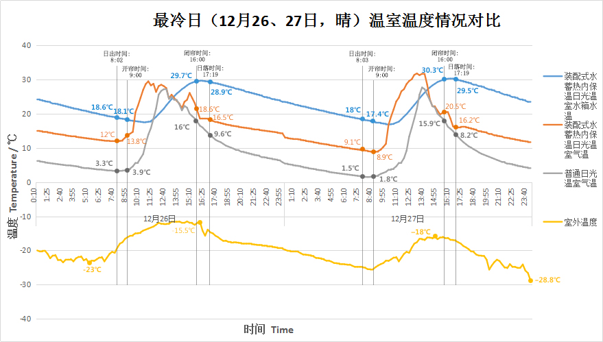 12月26日,晴天,室外氣溫-30℃,水蓄熱內外雙保溫裝配式日光溫室室內溫度29.5℃此時是上午10:55,氣溫12℃此時是在早晨的7:55。